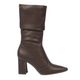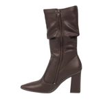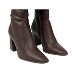 Na cor marrom, essa bota feminina salto bloco cria uma silhueta alongada graças ao bico fino e ao salto de 8,5 cm, sendo uma excelente escolha para produções de outono e inverno, eventos e looks urbanos com destaque.