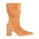 Com cano alto e bico fino, o modelo alonga visualmente a silhueta e traz sofisticação ao visual. O acabamento em camurça caramelo reforça o estilo elegante e contemporâneo da bota.