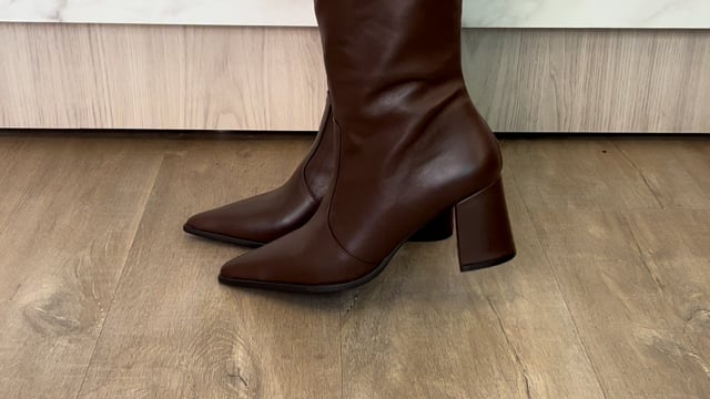 A bota feminina cano alto em couro na cor Veneto Brown é uma peça sofisticada e versátil para a temporada Inverno 2026. Com salto bloco de 7 cm e bico fino, o modelo une elegância e conforto, criando um visual refinado para diferentes ocasiões.