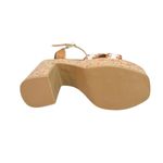 Seu cabedal é confeccionado em material sintético de alta qualidade, com tiras trançadas no peito do pé em tons caramelo e bege, trazendo um visual leve e sofisticado. O salto e a meia pata são revestidos em cortiça, o que proporciona um acabamento natural, perfeito para looks de verão e produções casuais ou mais elaboradas.