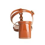 Sandália marrom caramelo, salto médio em bloco orgânico e tiras finas adornadas com elos metálicos dourados. Fechamento lateral com fivela, design minimalista e toque moderno para composições casuais ou noturnas.