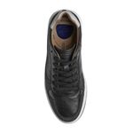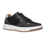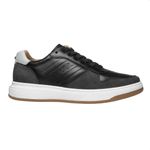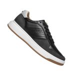 O acabamento em couro reforça a proposta de um sapatenis masculino em couro preto elegante e funcional.