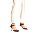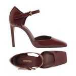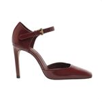 Scarpin Vinho Verniz. O sapato tem salto alto fino, ponta quadrada e cabedal fechado. É coberto no calcanhar e tem tira no tornozelo que fecha em fivela metálica lateral. Com palmilha da cor do sapato e inscrição do nome da marca.