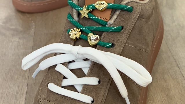Acompanha 3 opções de cadarços, incluindo modelo com pingentes decorativos